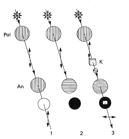 Für die leuchtenden, bunten Farben sind lineare Polarisationsfilter verantwortlich. Solch ein Polfilter (Polarisator) filtert ungerichtetes Licht einer Lichtquelle so aus, dass sich alle Lichtwellen nach Passieren des Filters in einer Schwingungsebene befinden. Ein zweiter Filter (Analysator) in exakter Kreuzstellung löscht dann dieses gerichtete Licht zu fast 100%. (Abb. Nr. 2)Gibt man nun einen Kristallkörper zwischen die beiden Filter verursacht dieser, dass die Lichtwellen wieder ein andere Schwingungsebene einnehmen und folglich nun auch nach Passieren des Analysators Licht hindurchlassen. (Abb. Nr. 3)